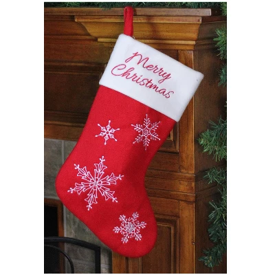 Santa Claus may present his charming gifts to you, anytime soon! So be prepared to stow all those gifts using this adorable holiday stocking, which showcases a traditional style of design in an attractive shade with a blanched cuff. Everything is perfect about this stunning accent for offering storage space to all your souvenirs!Product Features: Features a traditional red stocking with white cuff Reads “Merry holiday” with embroidered cuff and snowflakesComes ready-to-hang on a red fabric loop Care instructions: spot clean onlyRecommended for indoor use onlyDimensions: 16″ high x 9.25″ wideMaterial(s): polyester
