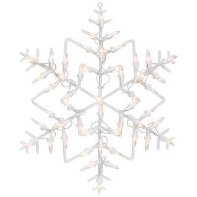This beautifully crafted snowflake decoration features white lights that will make your windows come alive with festive cheer. With a simple plug-and-play design, you can easily hang this decoration on any window or even on a wall. The durable construction ensures that you can use it year after year, making it a perfect addition to your holiday decor collection. Get ready to spread joy and happiness with this stunning snowflake silhouette.Product Features:Color: clear bulbs / white wireNumber of bulbs: 50Bulb size: mini24″ white lead cordDouble-sided design Additional Product Features:Super bright bulbsFully Assembled UL certified and approved for indoor or outdoor useDurable and reusable Comes with replacement bulbs, spare fuses and a suction cup for mounting the decorationSuction cup included Fully assembledContains 1 plug with end connector which allows you to stack multiple lighted items together (not to exceed 210 watts)120V, 60Hz, .17 amps, 20.4 wattsDimensions: 16″H x 13.75″W x .5″DMaterial(s): plastic/wire/glass bulbs