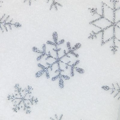 Add this gorgeous holiday stocking with multiple snowflakes to your holiday decor this year! Perfect to place all of your holiday goodies in, while adding some sparkle to your mantles. Simply hang on your stairways, holiday tree or bedpost.Product Features:Traditional white holiday stocking Designed with a folded white cuffVarious sparkling silver snowflakesStocking has a one-sided designComes ready-to-hang on a matching white loopRecommended for indoor decorative use onlySpot clean with mild detergent; do not washDimensions: 19″H x 10″W x .5″DMaterial(s): polyester