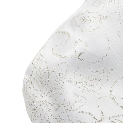 Add a little elegance to your holiday decor with our white and gold sheer organza holiday tree stocking. It comes with a glitter poinsettia design and satin wave-cut cuff for a traditional, yet chic and trendy look. A must-have season after season. Perfect for mantels and railings. Pairs beautifully with the matching holiday tree skirt, which may be purchased separately. Product Features:Gold glitter poinsettia designSheer organza fabricWhite satin wave cuffOne-sided designComes ready-to-hang on a white loop Recommended for indoor use onlyCare instructions: spot clean onlyDimensions: 20.5″ high x 10″ wideMaterial(s): polyester organza/satin