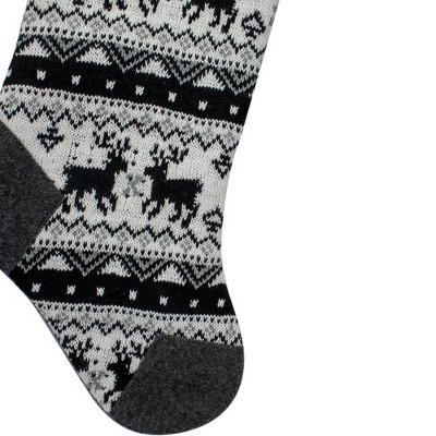 Capture that perfect feeling with this lodge-themed holiday stocking. This stocking is black and white Features a gray patch on the heel and toes, forest trees, triangles, and reindeer with different lined designs there are a high pile fleece cuff and fleece accents. With all of its patterns, this stocking is sure to complete your holiday lodge decor and bring compliments for many years to come from your guests.Product Features:Gray, white and black holiday stockingFeatures reindeer, trees, triangles, and striped designsThere are gray fleece accents on the heel and bottom of the stockingOne side design there is a red fleece backing Stocking has a white high pile fleece cuffEach comes ready-to-hang on a gray loopRecommended for indoor use only Dimensions: 21″ high x 8″ wide Material(s): polyester