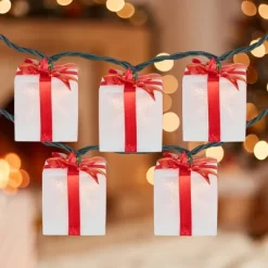 These captivating lights, featuring shimmering transparent white present-shaped bulb covers, will bring an air of elegance to any space. Each present is adorned with exquisite red and gold ribbon, adding a festive touch to your holiday celebrations. This light set is perfect for illuminating your holiday tree, mantel, or any other area in need of a magical glow. The green wire seamlessly blends with your existing decor, creating a seamless look. Whether you’re hosting a holiday gathering or simply enjoying a cozy night in, these lights will set the perfect ambiance for the season.Product Features:Color: clear bulbs / green wire Shimmering transparent white and red gift box light coversEach gift box measures 2″H x 2″W x 2″DNumber of bulbs on string: 10 Bulb size: mini Bulb type: incandescentSpacing between bulbs: 10″ Green lead cord length: 24″Tail cord length: 4″Lighted length: 7.5’Total length: 9.75’Additional product features: Steady burning bulbs Recommended for indoor use onlyContains end-to-end connectors which allow you to connect multiple sets together (not to exceed 210 watts)Comes with spare replacement bulbs and fuse Material(s): glass bulbs/plastic light covers/wire