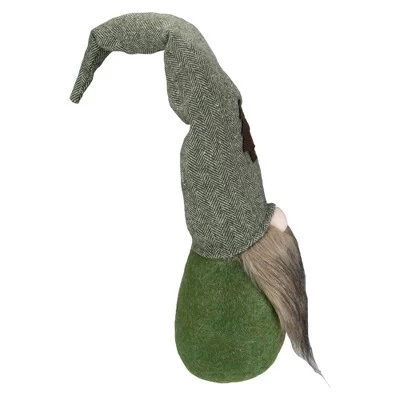 Gnomes are best known for guarding Earthly treasures, providing good luck, and are perfect for protecting your holiday goodies! This gnome is quietly enjoying your holiday and holiday festivities. Add this adorable little gnome to your family this holiday season to add some color, cuteness, and luck to your holiday decor! Features:Green and brown holiday gnomeThe gnomes body is olive greenHis hat is tan and olive with a striped designFeatures a dark brown holiday tree on his hat with a bendable tipTan and dark brown long beardThis gnome has no arms and sits on a weighted bottomFor indoor use onlyDimensions:21″H x 5″W 4″DMaterial(s):polyester