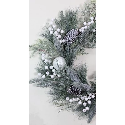 This beautiful wreath evokes a sense of winter’s icy chill with the frosted pine branches and pine cones. Features glitter white berries and decorated ball ornaments. Perfect for hanging on doors, mantles, or as a unique table decoration. Product Features:UnlitArtificial pine decorated holiday wreathFrosted mixed pine and pine cone holiday wreathAccented with white berries and ball ornamentsNo assembly required; wreath comes in 1 piece Recommended for indoor use onlyNatural vine twig base for hanging Recommended for indoor use Dimensions: 24″ in diameter (measured from outermost tip/edge to outermost tip/edge across the wreath) Material(s): plastic/pine cone/foam/twig