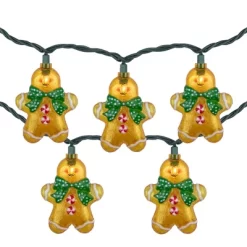 Run, run as fast as you can to snatch up these gingerbread men lights. These fun holiday lights are perfect for your holiday decorating. Great for your holiday tree, wreaths or garland!Product Features:Color: clear bulbs / green wire Gingerbread man cut out cookie with bow tie shape light covers Number of bulbs on string: 10 Bulb size: mini Spacing between each light: 10″Lighted length: 7.5’Approx. total length: 10’24” lead cord 5″ tail cordAdditional product features:Steady burning bulbs Straight line constructionUL certified and approved for indoor or outdoor use120 volts, 60 hertz, .08 amps, 9.6 watts End-to-end connectors allow you to connect multiple sets together (not to exceed 210 watts) Comes with spare replacement bulbs and fusesDimensions of each light cover: 3″H x 2.5″W x 1″D Material(s): plastic light covers/glass bulbs/wire
