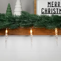 Create a magical winter wonderland with this set of holiday icicle lights. This elegant mini light strand features 10 warm white incandescent bulbs spaced 6 inches apart on a discreet clear wire, offering a soft, classic holiday glow perfect for holiday decorations, holiday parties, or cozy indoor winter decor. With a lighted length of 4.5 feet and a total length of 5.5 feet, including a 12-inch lead cord, this compact set is ideal for mantels, windows, staircases, doorways, or holiday centerpieces. The bulbs stay cool to the touch, making them safe for use around children and pets. Powered by just 2 batteries, this battery-operated holiday light set offers flexible, cordless decorating with a convenient on/off switch on the battery pack. Although designed for indoor use, these clear icicle lights can also be used outdoors in covered areas, such as a porch. The icicle-shaped design adds a frosty, glass-like aesthetic, perfect for pairing with snowflake lights, silver garland, or frosted ornaments to enhance your holiday or winter-themed decor. Non-replaceable bulbs offer simplicity and hassle-free enjoyment all season long.Product Features:Color: warm white bulbs / clear wire Number of bulbs on string: 10Bulb size: miniBulb type: incandescentSpacing between each bulb: 6”Lighted string length: 4.5Total string length: 5.512” clear lead cord6″ high x 1″ diameter iciclesAdditional Product Features:Bulbs stay cool to the touchNon-replaceable bulbsRequires 2 ‘AA’ batteries – not includedConvenient on/off switch on the battery packRecommended for indoor use – if using outdoors, place under a covered areaNote: 10 count of lights includes only 1 strand of lights with 10 bulbs