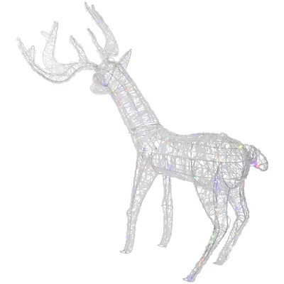 This well done reindeer decoration adds the perfect amount of light to your outdoor holiday display. The LED color changing lights provide the perfect holiday glow, changing from warm white to multi-color. Whether it’s used indoor or outdoor, this durable, acrylic display will add joy to your decor season after season. Product Features:Pre-lit with 150 lightsLights change from warm white to multi-colorBulb size: miniBulb type: LED33ft covered copper wire lead cordAdditional product features:LED lights use 90% less energy Lights stay cool to the touch Some assembly requiredGround stakes and cable ties includedLights are UL approved and certified for indoor or outdoor useAdapter: 4.5V/2.4WContains UL IP44 transformerDimensions: 46.5″H x 32″W x 10″DMaterial(s): acrylic/metal/wire/foam