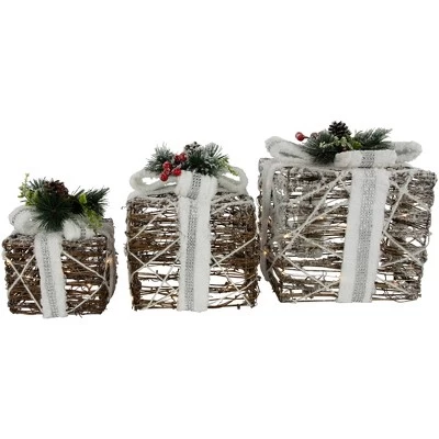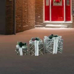 Get into the holiday spirit with this gift box set. This set features elegant-looking pre-lit gift boxes, embellished with holly berries, pine needles, and white bows. These will be the perfect addition to your mantle, tabletop, or anywhere you wish to add a little holiday charm.Product Features:holiday gift boxes decorationDecorated with holly berries and pine needlesBulb size: microBulb type: LEDPre-lit with 60 warm white lightsEach requires “AA” batteries – not includedConvenient On/Off switchRecommended for indoor useLights per box:Small: 15 lightsMedium: 20 lightsLarge: 25 lightsDimensions:Small: 6″H x 6″W x 6″D Medium: 7.75″H x 7.75″W x 7.75″DLarge: 9.75″H x 9.75″W x 9.75″DMaterial(s): rattan/metal/foamSet includes 1 of each item shown, totaling 3