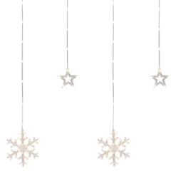 Spread the feeling of holiday everywhere in your home with these window curtain LED stars and snowflakes. Perfect for hanging in your windows. LED bulbs are cool to the touch and use much less energy than a traditional incandescent bulb. The snowflakes and stars makes them great to display the whole winter season.Product Features:Color: clear bulbs / clear wire Number of bulbs on string: 250Bulb type: LEDBulb size: micro-fairyCurtain contains 10 alternating drops of large snowflakes and small stars Each large snowflake contains 20 bulbs Each small star contains 5 bulb Approximate drop lengths: 2.25′ or 3.5’Spacing between each small light on drop: 4″ Spacing between each drop: 8″ Lighted length: 4.75’Total length: 6’11.75″ clear lead cord Additional Product Features: LED lights use 90% less energy Cool to the touchIf one bulb burns out, the rest will stay lit Contains a class 2 power supply AC adapter plug, indoor onlyUL certified and approved for indoor or outdoor usePower unit input: 120V, AC 60Hz, 0.20APower unit output: 4.5V, 0.80ANote: 250 count of lights includes only 1 strand of lights with 250 bulbs