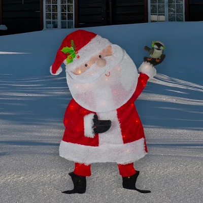 A great addition to your yard art this holiday season is this adorable Santa Claus! He is wearing his red suit with black boots and mittens. The happy little bird and Santa are ready to join in your festivities!Product Features:Lighted outdoor Santa decoration Pre-lit with 50 warm white lightsOne sided decorationUL certified and approved for indoor and outdoor useEasy assembly requiredGround stakes are included44″ white lead wireDimensions: 32”H x 22”W x 3”DMaterial(s): chenille/wire