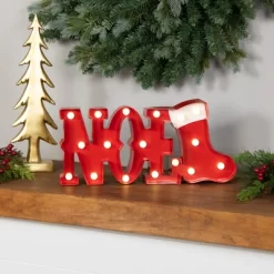 Glowing with festive charm, our lighted tabletop holiday sign adds a touch of holiday magic to any space. Crafted with care, the word “Noel” emerges in bold block letters, with the ‘L’ cleverly formed by a classic holiday stocking. Adorned in a rich shade of red and softly illuminated by warm white lights, this delightful decoration brings joy and cheer to your seasonal decor. Whether displayed on a mantel, shelf, or tabletop, it’s sure to spark the spirit of the season and create a merry ambiance for all to enjoy.Product Features:Lighted holiday tabletop decorationPre-lit with 17 warm white lightsShowcases “Noel” in block lettering with a stocking as the “L”Required 3 “AA” batteries; not includedOn/off switch located on the backFor indoor use onlyDimensions: 7.5″H x 16″W x 2″DMaterial(s): metal/plastic