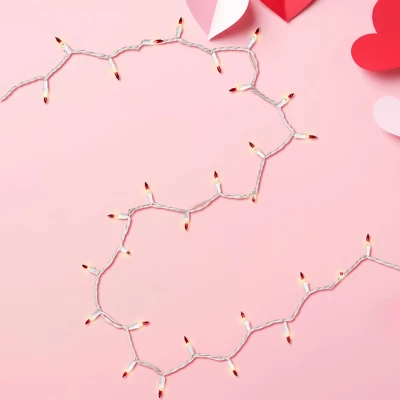 Brighten up your space with these 50-count mini holiday lights in red and clear. Perfect for creating a warm, cozy atmosphere during the holiday season, these versatile lights also add a charming touch for Valentine’s Day decorations. Whether you’re decking the halls or setting a romantic mood, these lights offer a delightful glow that’s sure to enhance any occasion.Product Features:Color: clear bulbs with red tips / white wireNumber of bulbs on string: 50Bulb size: miniBulb type: incandescentSpacing between each bulb: 2.5″Lighted length: 10’Total length: 11.25’12” lead cord3″ tail cordAdditional Product Features:UL certified and approved for indoor or outdoor useIf one bulb burns out, the rest will stay litLights are equipped with Lamp Lock feature, which makes them replaceable, interchangeable and keeps them from falling outComes with replacement bulbs, flasher bulbs and spare fusesContains end-to-end connectors which allow you to connect multiple sets together (not to exceed 210 watts)Wire gauge: 22120 volts, 60 hertz, .17 amps, 20.4 watts
