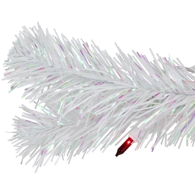 Experience the enchantment of the holiday season with this charming artificial holiday tree. Its compact size makes it perfect for adding a touch of festive magic to any space. Adorned with a captivating blend of matte white and clear iridescent needles, this tree offers a unique and sophisticated twist on traditional holiday decor. The multi lights add a playful yet elegant shimmer and the iridescent needles beautifully reflect the soft glow.Product features:Pre-lit with 35 multi-color lightsMulti-color consists of red, green, blue, orange and purple bulbsBulb size: miniBulb type: incandescent64 tips2.5″ wide branch tips27″ white lead cordMedium profile treeEasy assembly: simply connect the stand legs to the baseAdditional product features:Light sets on tree are UL listed for indoor or outdoor use, however, the tree itself is recommended for indoor use only If one bulb burns out, the rest will stay litLights are equipped with Lamp Lock feature, which makes them replaceable, interchangeable and keep them from falling outIncludes a white plastic tree standWire gauge: 22120 volts, 60 hertz,.12 amps, 14.4 watts Dimensions: 2′ high (from the base of the stand to the top of the tree)16″ base diameter (at the widest point)Material(s): PVC/plastic/glass bulbs/wireNote: Branches are compressed for shipment, and need to be fluffed out upon arrival to look like the photo.
