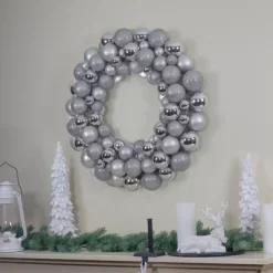 Update your holiday decor with this shatterproof ball wreath. Designed with shiny, matte and glitter ornaments for added depth. Shatterproof ornaments combine the beauty and luster of real glass with the unbreakable practicality of plastic. Perfect for mantles, walls and doors.Product Features:Matte, shiny and glitter silver ball ornamentsDurable, double metal frame with decorative silver tinsel For indoor use onlyNo assembly required – wreath comes in 1 pieceDimensions: 36” diameter (measured from outermost edge to outermost edge across the wreath) Material(s): plastic/metal
